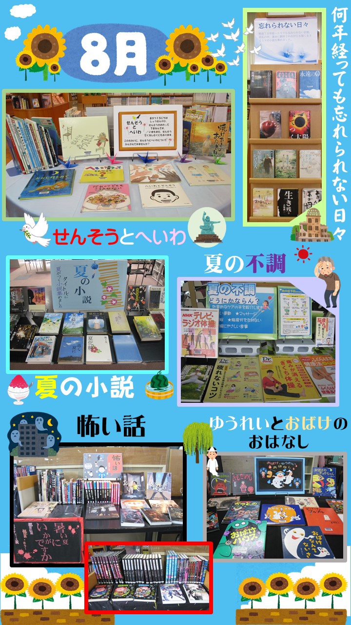 阿蘇図書館では「何年たっても忘れられない」「せんそうとへいわ」、一の宮図書館では「夏の小説」「夏の不調」「怖い話」「ゆうれいとおばけのおはなし」の展示を行っています。ご来館お待ちしています。