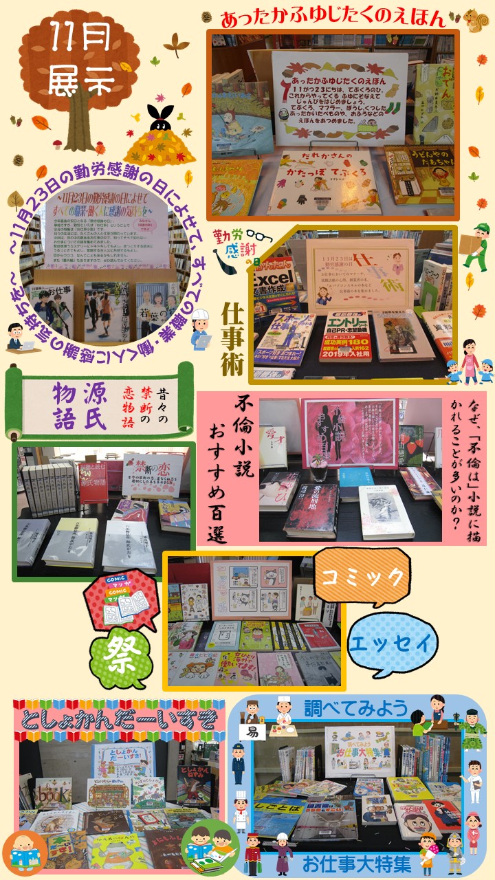 阿蘇図書館では「11月23日勤労感謝の日によせて」「仕事術」「あったかふゆじたくのえほん」、一の宮図書館では「コミックエッセイ祭」「不倫小説おすすめ百選」「としょかんだーいすき」「調べてみよう お仕事大特集」のテーマで展示を行っています。ご来館お待ちしています。