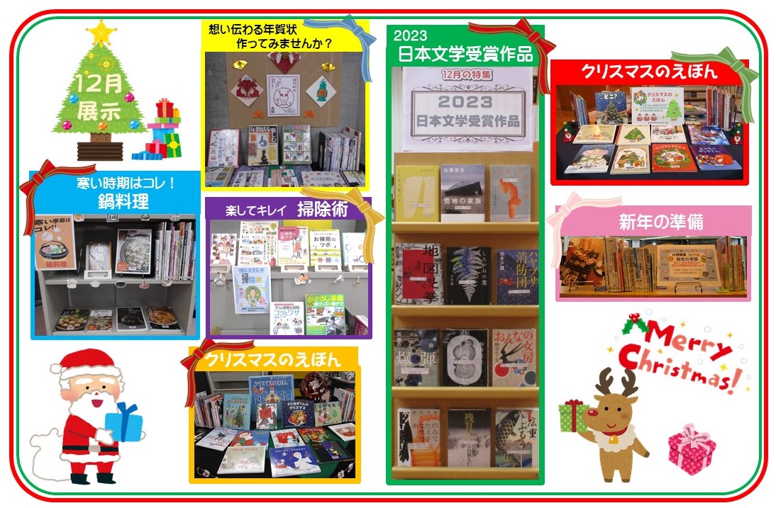 阿蘇図書館では「2023 日本文学受賞作品」「新年の準備」「クリスマスの絵本」、一の宮図書館では「寒い季節はコレ!鍋料理」「楽してキレイ掃除術」「想いが伝わる年賀状作ってみませんか」「クリスマスのえほん」の展示を行っております。