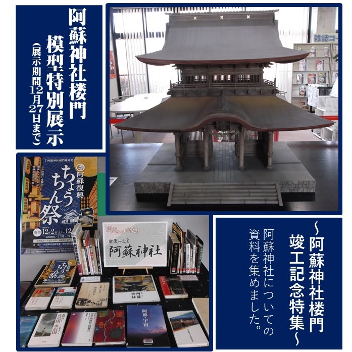 また、一の宮図書館では、阿蘇神社楼門竣工記念として楼門模型の特別展示(期間12月27日まで)を行っています。ご来館お待ちしています。